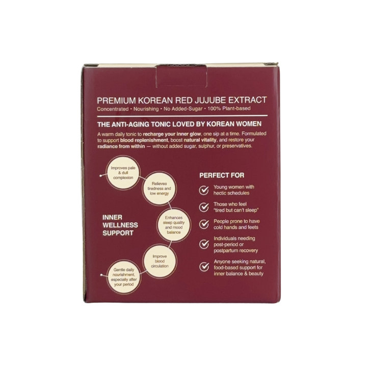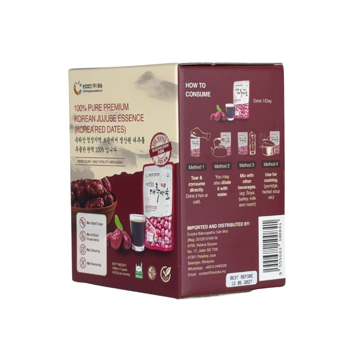 ORIGIN: Bo-eun, South Korea (Only using red dates farmed and harvested fresh from their own farm in the Boeun-gun that is famous for its high-quality red dates and pollution-free environment)