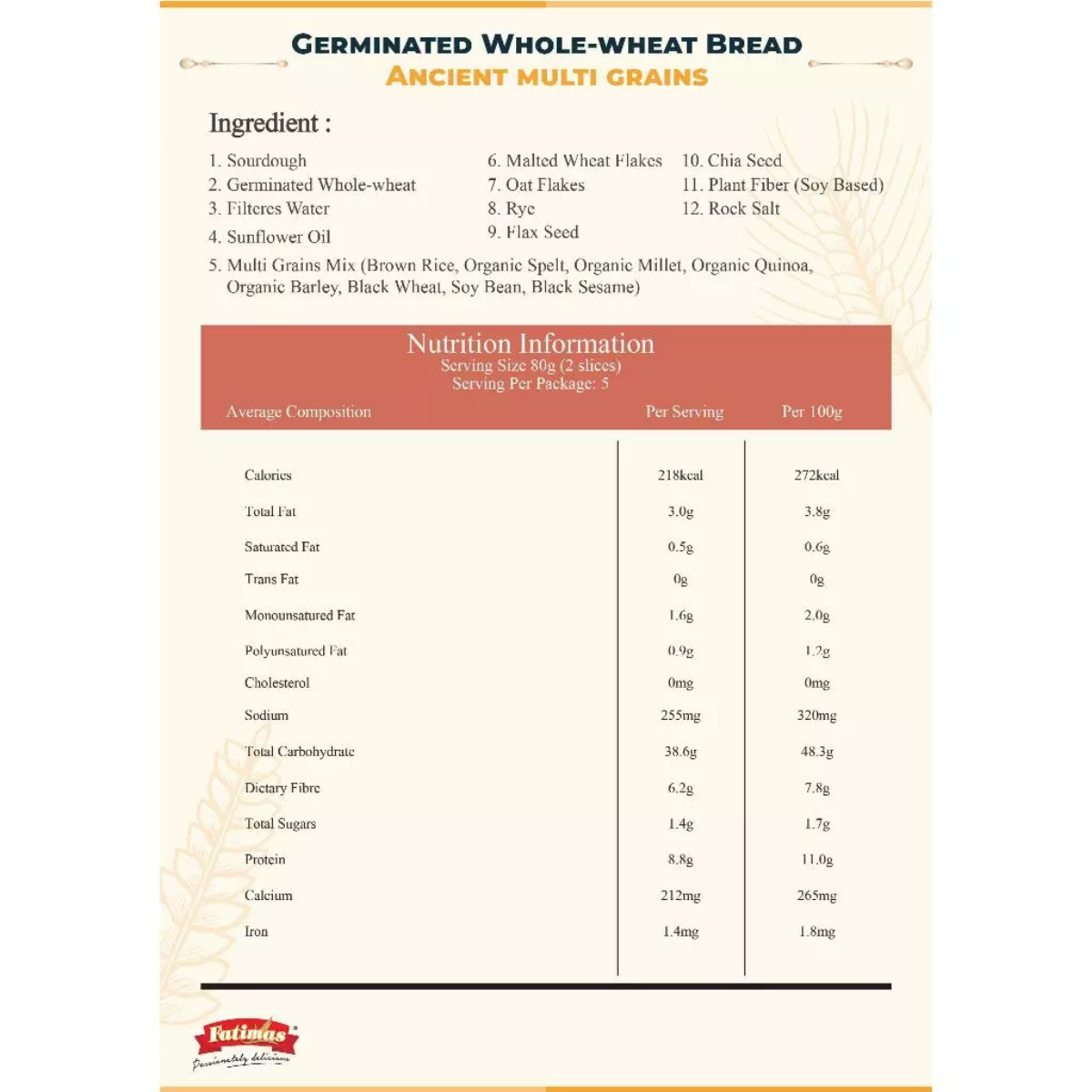 𝐈𝐧𝐠𝐫𝐞𝐝𝐢𝐞𝐧𝐭𝐬 : Sourdough (Wheat 15%) Sprouted Whole Wheat, Filtered Water, Malted Wheat Flake, Multi Grains Mix ( Brown Rice, Organic Spelt, Organic Milet, Organic Quinoa, Organic Barley, Black Wheat, Soy Bean, Black Sesame ), Sunflower Oil, Oat Flakes, Rye, Flax seed, Chia Seed, Plant Fiber (Soy Based) and Rock Salt