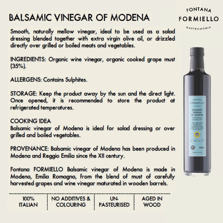 A skillful blend of grape must and wine vinegar matured in wooden barrels, Fontana's balsamic vinegar of Modena PGI is unpasteurised, unfiltered and without any caramel colouring. Its smooth, naturally mellow profile blends beautifully with extra virgin olive oil in a salad dressing. Balsamic Vinegar of Modena has been produced in Modena and Reggio Emilia since the XII century.