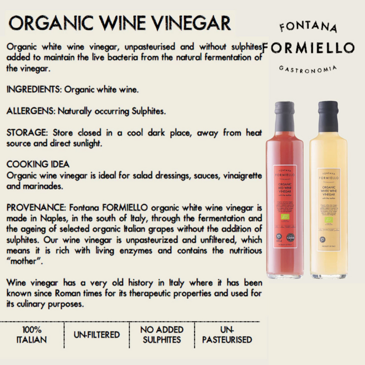 The natural fermentation and ageing of selected organic Italian grapes yields a white wine vinegar with a mild, fruity flavour, ideal for use in marinades, sauces and vinaigrettes. Unpasteurised, unfiltered and with no added sulfites, Fontana's vinegar is rich in live bacteria and contains the nutritious 'mother'. Wine vinegar has a very old history in Italy where it has been prized since Roman times for its therapeutic properties and culinary uses.