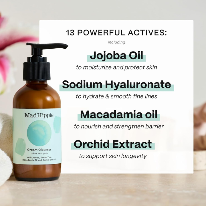All Mad Hippie products are fragrance free, clinically proven to be non-irritating, and never tested on animals. This product is also certified #vegan and GMO free. Product recyclable packaging is printed using soy inks with 100% wind energy. [ What does it do? ] Mad Hippie Cream Cleanser glides over skin to cleanse and remove dirt, impurities and light makeup thoroughly, yet gently. Skin feels soft, supple and relaxed with each pleasant cleanse.