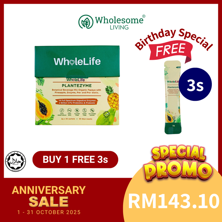 - Take 1 sachet of Wholesome+ Plantezyme 1 hour before meal: avoid indigestion and help appetize.